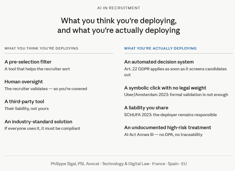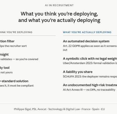 In conversations with HR directors and legal teams, the same blind spots recur: tools deployed without consolidated mapping or legal qualification, purely formal human-in-the-loop, supplier contracts with no DPA or AI Act clause, no decision traceability.